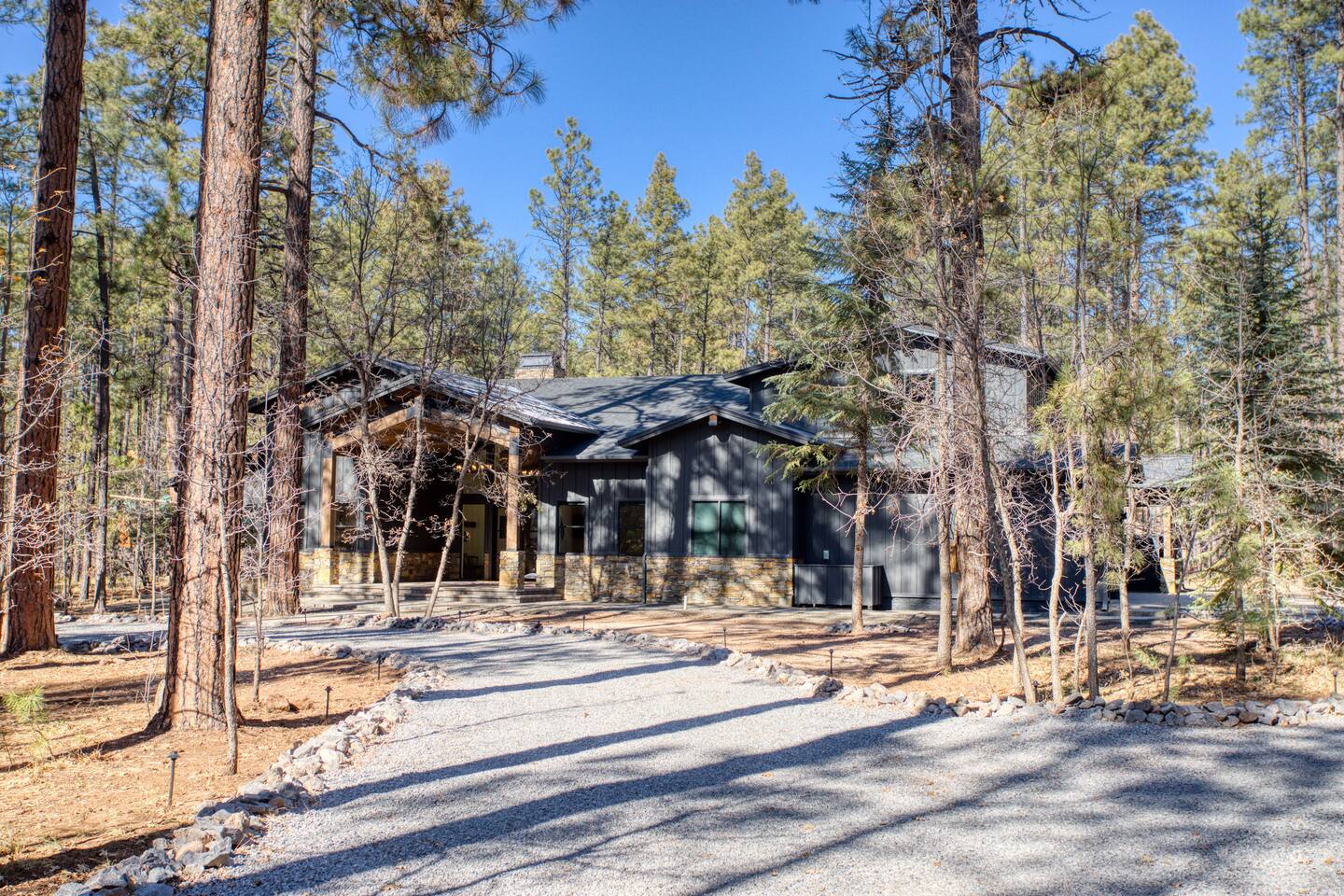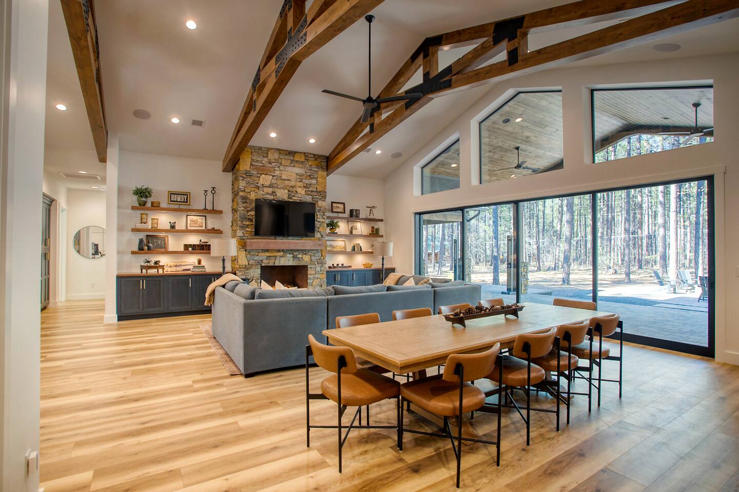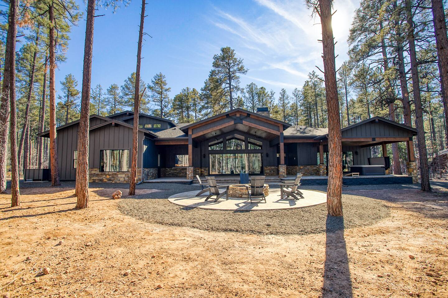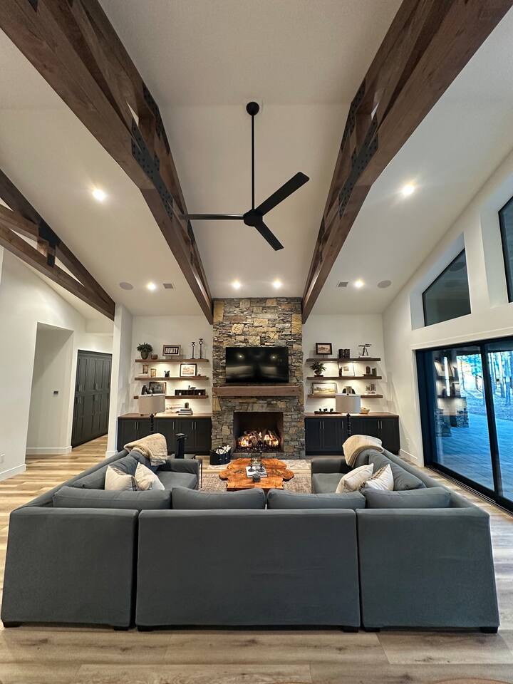 This 5,000 sq ft mountain-modern home, located in the exclusive White Mountain Summer Homes, offers the perfect mix of luxury and comfort. Gather in the great room, cook in the chef’s kitchen, play in the game room, unwind on the private spa deck, and relax by the gas firepit under the pines. Ideal for families and groups, the home features warm design, premium furnishings, and peaceful mountain surroundings for a truly memorable stay.