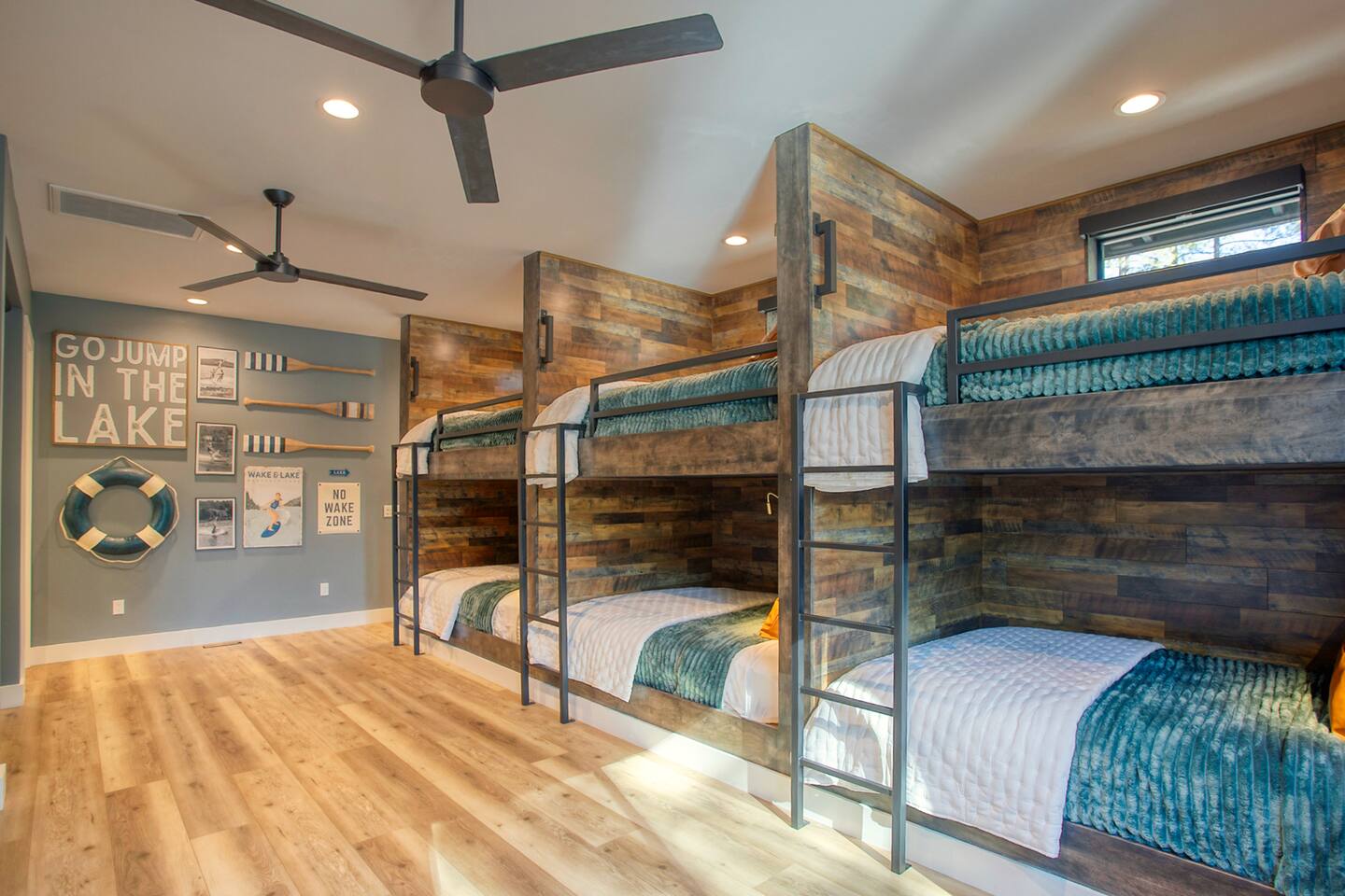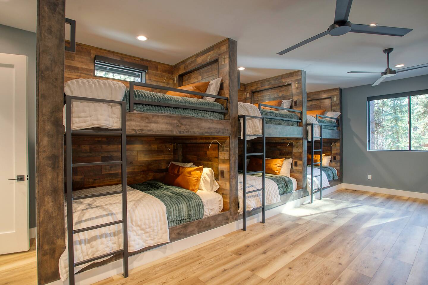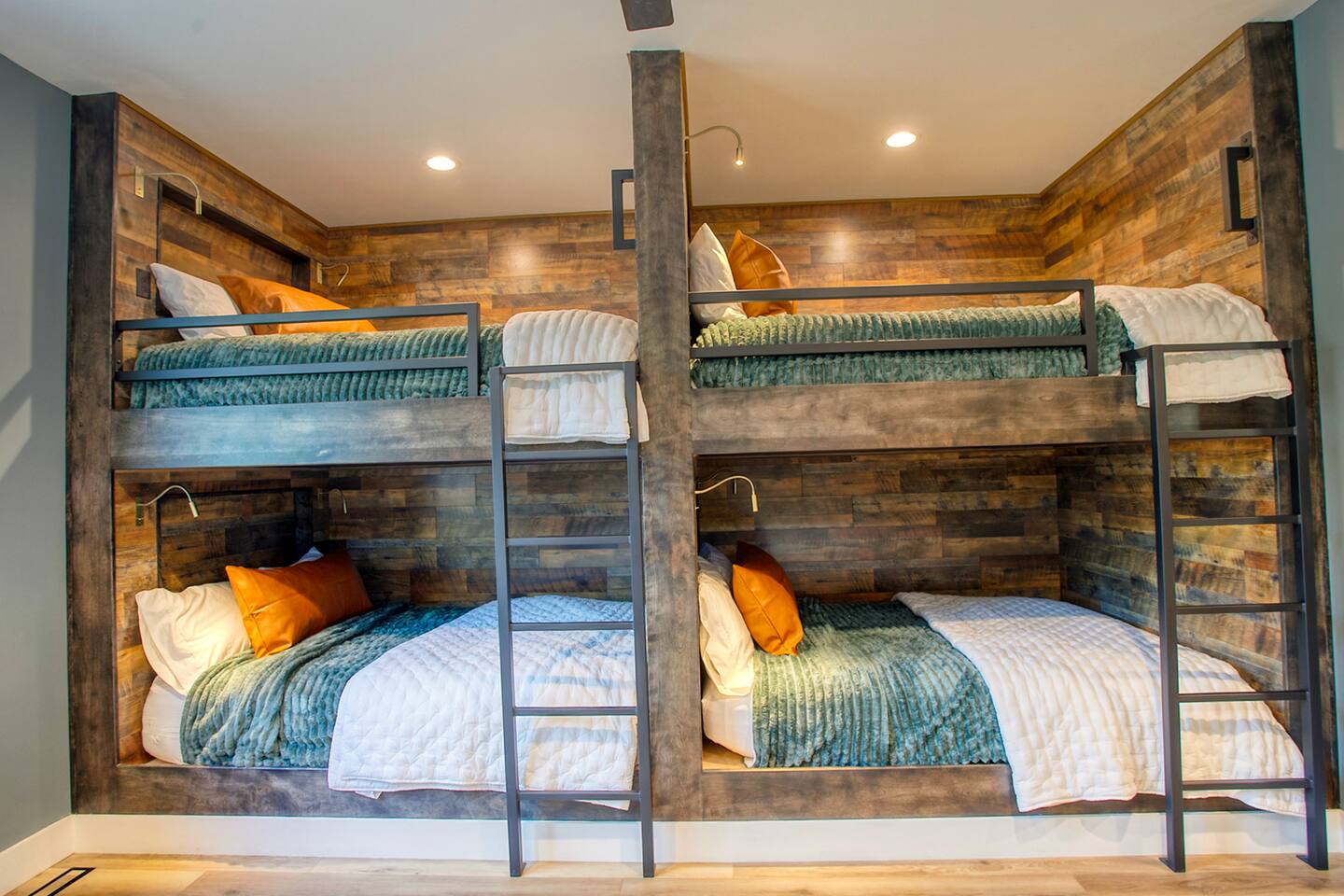 Where You’ll Sleep & Shower Pinetop Bedroom (Primary 1) • King bed • En-suite bathroom with shower, soaking tub, and double sinks Hiking Bedroom (Primary 2) • King bed • En-suite bathroom with shower Ski Bedroom (Guest 1) • 2 Queen Beds Golf Bedroom (Guest 2) • 2 Queen Beds Bathroom Access: Across the hall from these two bedrooms is a full bathroom with: • Double-sink vanity • Private shower room Plus, the game room has a half bath for convenience if the hall bath is occupied. Lake Bunkroom (Guest 3) • 10 Queen Beds • En-suite bathroom with tub/shower combo Additional Bathroom: • Half bath located downstairs off the mudroom for extra convenience • NOTE: If you do not need to use the Bunk Room for your getaway, use discount code NOBUNK to get a $250 credit on your booking.