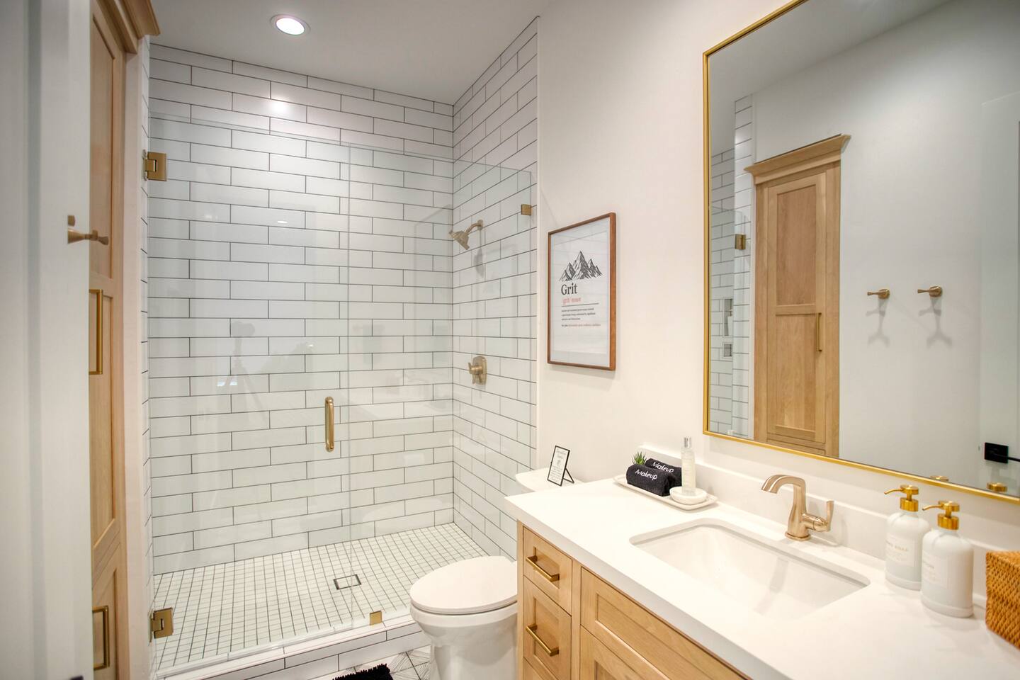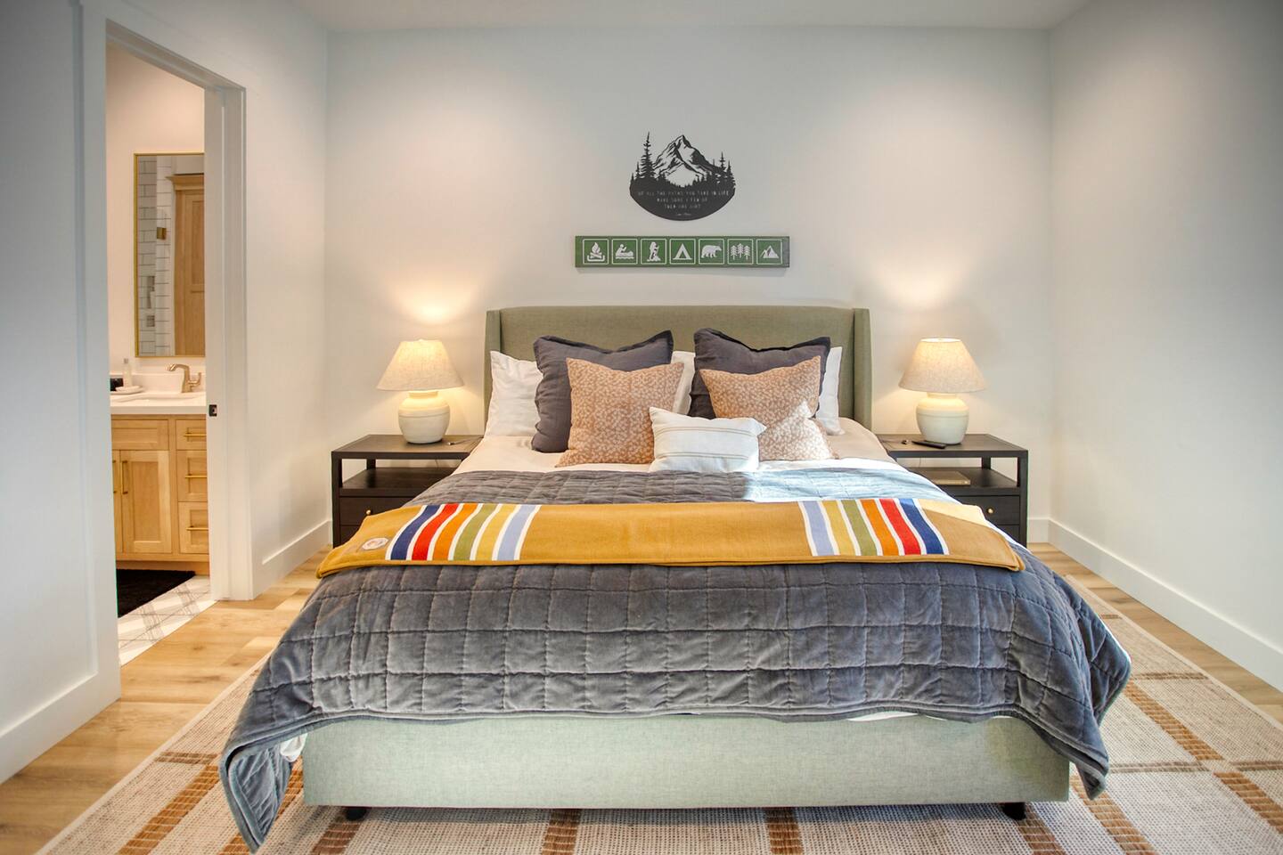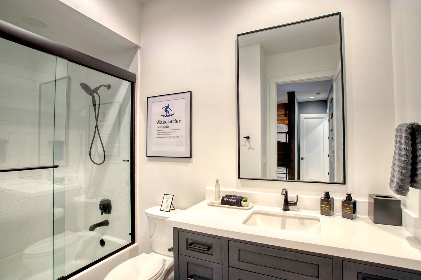 Where You’ll Sleep & Shower Pinetop Bedroom (Primary 1) • King bed • En-suite bathroom with shower, soaking tub, and double sinks Hiking Bedroom (Primary 2) • King bed • En-suite bathroom with shower Ski Bedroom (Guest 1) • 2 Queen Beds Golf Bedroom (Guest 2) • 2 Queen Beds Bathroom Access: Across the hall from these two bedrooms is a full bathroom with: • Double-sink vanity • Private shower room Plus, the game room has a half bath for convenience if the hall bath is occupied. Lake Bunkroom (Guest 3) • 10 Queen Beds • En-suite bathroom with tub/shower combo Additional Bathroom: • Half bath located downstairs off the mudroom for extra convenience • NOTE: If you do not need to use the Bunk Room for your getaway, use discount code NOBUNK to get a $250 credit on your booking.